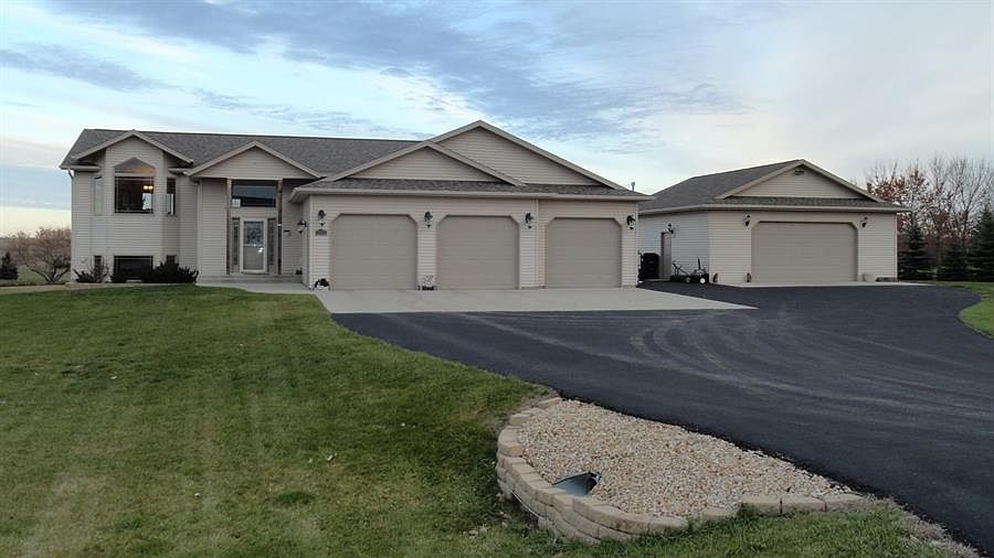 Country living close to town on 1.5 acres with an oversized triple attached garage plus a 28 x 32 detached shop/garage! ASPHALT all the way up to the home! Peaceful setting in an established country development. Beautiful home with over 3,100 sq. ft. finished. The main floor boasts cathedral ceilings, neutral dcor & an open floor plan. The kitchen offers NEW GRANITE COUNTER TOPS, stainless steel appliances, tile backsplash, walk-in pantry & counter for stools. The dining area has access to the MAINTENANCE FREE DECK & large yard with fire pit. The main floor has 3 bedrooms & 2 bathrooms including the master bedroom suite with walk-in closet & private bathroom. All 3 bathrooms have new granite counter tops. The WALKOUT LOWER LEVEL FAMILY ROOM features a gas fireplace, laundry room with numerous cabinets & sink, full bath, large bedroom with walk in closet & office/den with French doors (could be another bedroom). The covered concrete patio has a large grill that is already set up with a natural gas line. The attached, heated 3-car garage has a floor drain & hot/cold water. Dont forget the extra 28 x 32 shop and the wonderful, private setting!