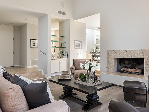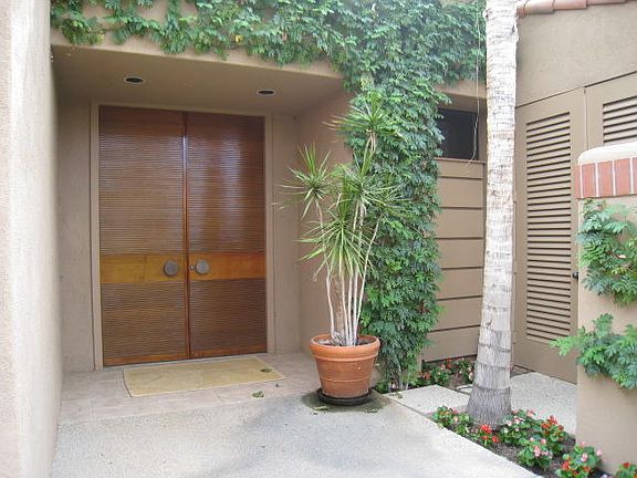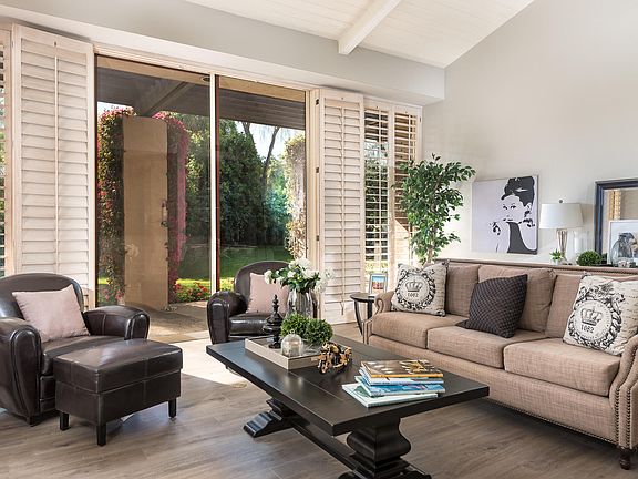 RARE OPPORTUNITY AVAILABLE on Cottage Unit in Prestigious Vintage Country Club! No Membership available to Club or its amenities. Turn-Key Cottage Unit with full use of common pool/spa only. Contemporary architectural design features high-sloped ceiling, oversize picture windows full-length doors. C Plan Cottage, One-level 2 bedroom, Open living room with vaulted wood finished ceilings, fireplace and plantation shutters on sliders to rear patio that enjoys beautiful green-belt and mountain views. Separate Dining Area also accessing rear patios. Kitchen Island sink, granite counters, bright breakfast area open to front private courtyard. Master suite vaulted ceilings and custom built-ins and garden floor-ceiling windows in tub & shower area. Large entry, tiled floors, wood in living room, and carpet in bedrooms. Guest bedroom is its own Jr. Suite. Built-in glass shelves, laundry room, Dual Zoned A/C, 2 car detached private garage and 1 golf cart garage space included. All just waiting for your personal decor choices to make it your own. Seek Purchaser wanting to own in beautiful Community and not wanting Club Membership with Ownership. Full time common area security and incredible grounds for morning walk. Close to all including famous El Paseo Shopping District.