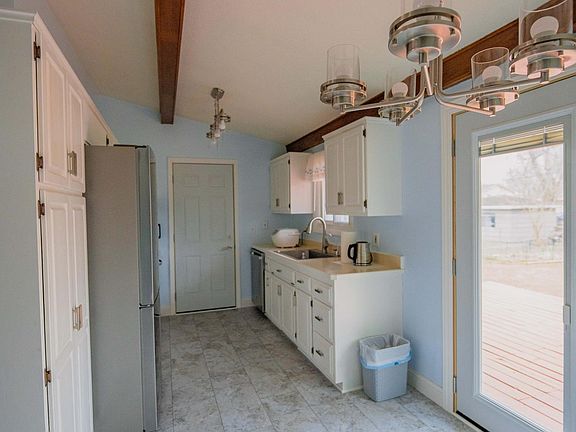 vaulted & beamed living room & kitchen, and beautiful bayed front window. Three bedrooms on same level