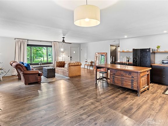 Welcome to your charming ranch oasis! This delightful 2-bedroom home offers a seamless open floor plan and boasts a complete update, ensuring modern living in a picturesque setting. Resting on two acres of tranquil land, this property comes with a detached 2-car garage and a covered carport. Step inside to discover the beauty of wood flooring that graces the entire home. The kitchen has been updated and includes all-black refrigerator, dishwasher, and stove, while the open floor plan creates an inviting space for both relaxation and entertainment. The full walk-out basement provides ample storage and potential for customization. Imagine spending warm evenings on your patio, savoring the serene atmosphere and gathering around the firepit with friends and family. This backyard is your private haven, perfect for outdoor activities and making lasting memories. Nestled in a peaceful neighborhood, this charming ranch offers the perfect balance of privacy and convenience, with a location that is just a short drive to Dorothy Lane Market and Austin Landing.