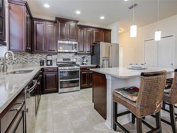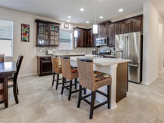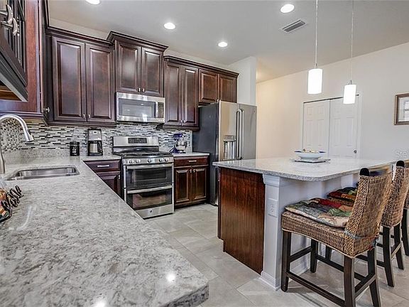 This home in the highly desirably community of Greyhawk Landing lives large with a well-designed floorplan including an open kitchen with island overlooking family room, 3 bedrooms, den and 2.5 baths. Home is generously and beautifully upgraded, including cambria quartz countertops throughout, modern gray rectangular tile, wood flooring and French doors in den, stainless steel appliances, 42-inch java cabinets with upper crown molding, large kitchen island, all glass shower enclosure, tankless gas water heater, gas stove and gas dryer. Extra windows offer ample natural light and the feel of welcoming the outside, inside. Stone elevation, gutters, mature landscaping and a screened-in covered entry complete the exterior. And the best for last - enjoy true Florida living from 1200 sq. ft. of screened-in outdoor living space with a gas HEATED SALTWATER POOL that includes a sun shelf, waterfall feature, 3-6 feet deep, and upgraded LED light changing colors, perfect for entertaining or relaxation. Lush Areca palm trees border the pool cage for privacy and green space. Greyhawk Landing is a guard-gated community, has two oversized community pools, lagoon style and lap style, fitness center, nature trails, playground, basketball courts, tennis courts, sports fields and fishing lakes. Take advantage of everything this location has to offer nearby - Lakewood Ranch , Costco, shopping, dining and some of the most amazing beaches in the world. Make this home yours today!
