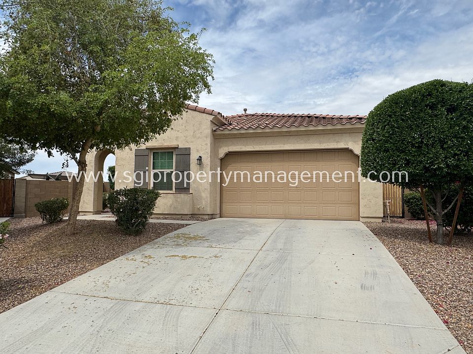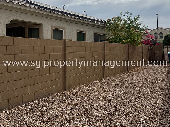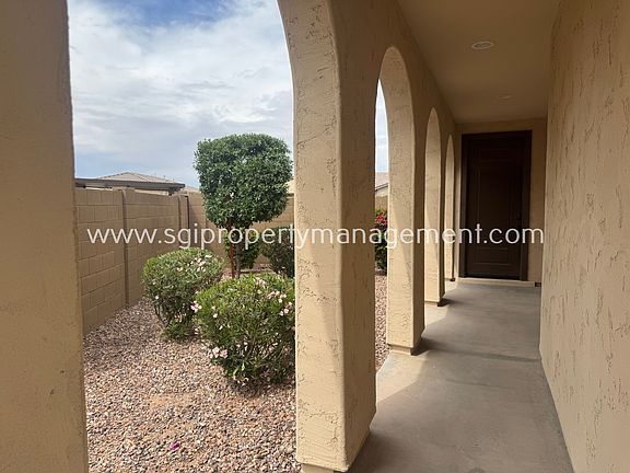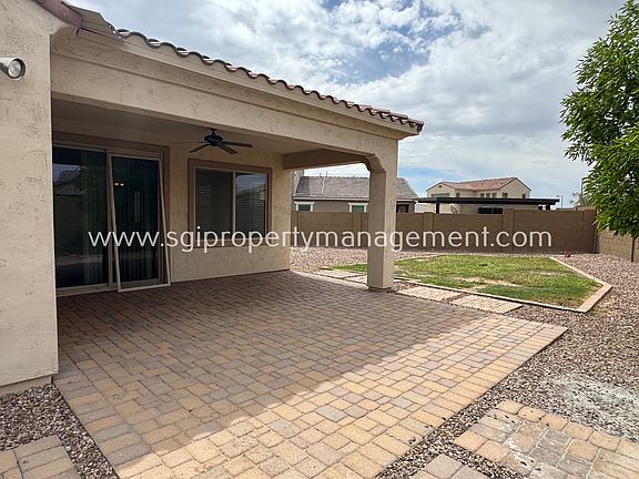 Spacious 3-bedroom 2-bathroom home with a den located in Buckeye's sought-after Blue Horizons community. Boasting 1,820 square feet, highlights include an open kitchen with granite counters, a gas range, double ovens, and pantry. The master suite features a private bathroom with dual sinks and a walk-in closet. Enjoy amenities including a washer and dryer, oversized tile flooring, and blinds throughout. Outside you will find a lush grass yard and covered patio with pavers. Community perks include multiple parks, playgrounds, sports courts, and more. Pets conditional. Lessee to verify all info.