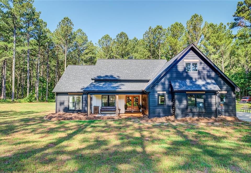 There is nothing quite like a home that breaks the rules. Decked out in black both inside and out, this distinctive property is certainly one-of-a-kind. Nestled on 5.09 acres, this single story 4BR/2BA open concept floor plan has all the upgrades.The open floor plan seamlessly connects this custom kitchen to the inviting living spaces, creating the perfect flow that's ideal for entertaining both indoors and out. The large master bedroom features vaulted ceilings, floor to ceiling tile in the glass shower, a deep soaking tub, separate vanities and a walk in closet that connects to the oversized laundry room. This split bedroom floor plan allows for an additional three bedrooms and full bath to be on the opposite side of the master suit. The covered front porch overlooks a front fenced pasture, just off of the family room you can access the backyard with a generously covered patio space equipped with a small pool and a fire pit perfect for unwinding at the end of the day. Schedule a showing to see it in person TODAY.