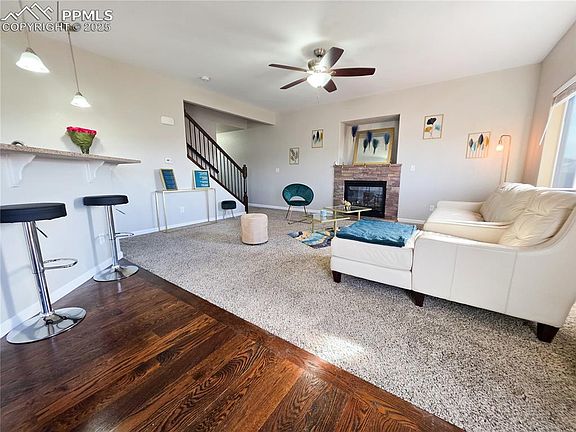 Welcome to this stunning, luxurious 4-bedroom, 3.5-bath home, perfectly nestled between Fort Carson Army Base and Peterson Space Force Base. Prepare to be captivated by the breathtaking mountain views that promise to leave you in awe. As you step inside, you're greeted by a stylish half bath and a beautifully designed living room featuring a cozy fireplace, inviting you to relax and unwind. Gleaming hardwood floors guide you into the elegant dining area, where a spectacular granite breakfast bar beckons you to enjoy delightful meals with family and friends. The gourmet kitchen, adorned with modern stainless-steel appliances, is thoughtfully crafted to elevate your cooking experience, making every dinner a grand occasion. Venture down to the finished basement, where an open-concept design offers endless possibilities. This versatile space can serve as a cozy bedroom or a lively playroom perfect for entertaining the family. Movie nights will be unforgettable with the projector wall, and the full bathroom boasts exquisite light-up waterfall finishes, adding a touch of luxury to your relaxation. Step outside and entertain guests on the delightful walkout patio or the freshly painted deck, transforming this home into your ultimate gathering spot. The beautifully landscaped backyard features an in-ground sprinkler system, ensuring a lush oasis for outdoor enjoyment. As you explore the top floor, you'll find 3 generously sized bedrooms and 2 full bathrooms. The main suite is a true retreat, offering unparalleled mountain views that will make every day feel special. The en suite bathroom features an expansive walk-in closet. You will not find a better closet! With a double vanity, wall-to-wall mirrors, a luxurious soaking tub, and a separate shower with a built-in seat, this bathroom is nothing short of a personal oasis where elegance meets comfort.