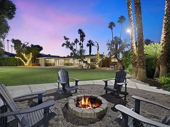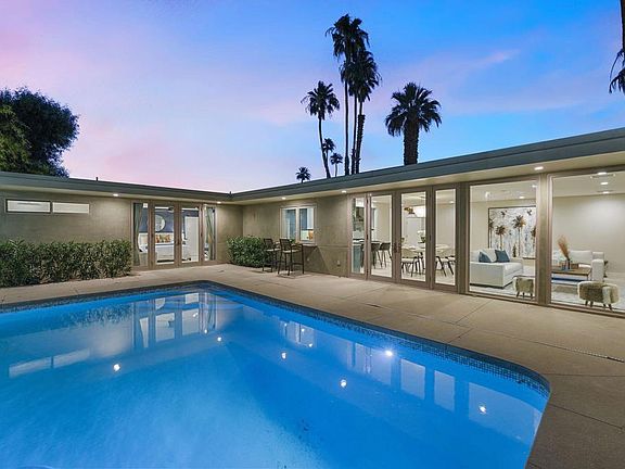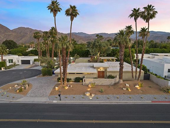 Private South Palm Desert Retreat on a Double LotClassic Mid-Century style architecture combined with mature, resort-like landscaping creates a unique feeling of simplistic, spacious living. Situated on nearly a half-acre double lot, occupying half of the cul-de-sac, the world around you disappears as you take in the beauty of your surroundings. The original home, built in 1963, was taken to the studs and meticulously rebuilt in 2019, including all new wiring, underground plumbing, 2x6 framing, all new HVAC and ducting, smooth stucco exterior, and much more! Walls of glass in the living room, kitchen and primary suite open to the pool and south-facing backyard offering wonderful natural light and picturesque views. The main house contains the primary suite with a walk-in closet, a spacious marble double shower, and an extra large soaking tub. Two guest bedrooms with a Jack and Jill bath, an office, powder room, and a generous laundry room with ample storage rounds out the floor plan. The guest house was added in 1979 and offers a bedroom and bath, kitchenette, a large open living area, and a four-car double tandem garage, for a total of six garage spaces! A private gate at the end of the cul-de-sac leads to the guest-house garage and a sizeable multi-use driveway - perfect for Pickleball, sport court, or extra parking. All of this in the heart of South Palm Desert - a truly great opportunity! We look forward to your visit!