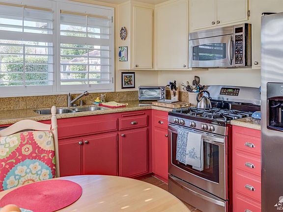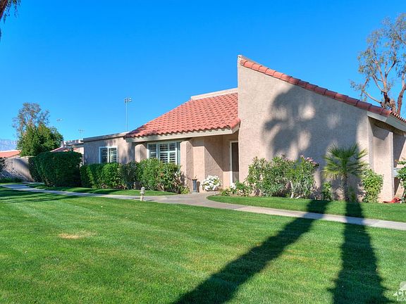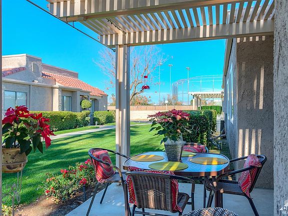 Opportunity knocks at your door!. Desirable community, GREAT location in Palm Desert!. Charming, cozy, ready to move in, end unit condo on a green belt a few steps from one of the community pools. Many upgrades, granite counters, Thomasville cabinets, custom shutters all throughout, cover patio, double high ceiling in the living room, views from everywhere, nest system. Newer washing machine and dryer. Newer A/C compressor and condenser, newer water heater, roofs where done in the HOA entirely two years ago, double garage w/floor. IDEAL for you, for me and everyone who loves the desert life!. Near shopping areas and best schools in the valley. Believe me it won't last!