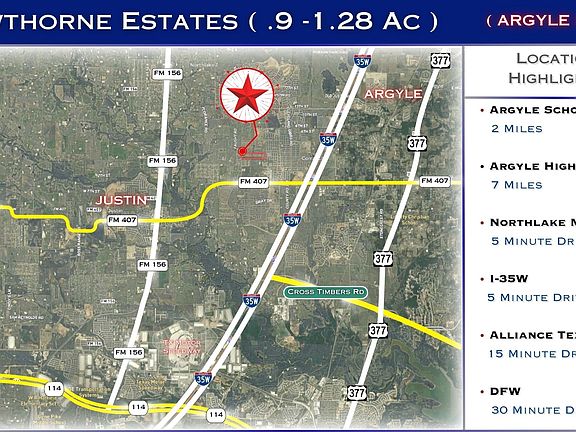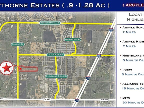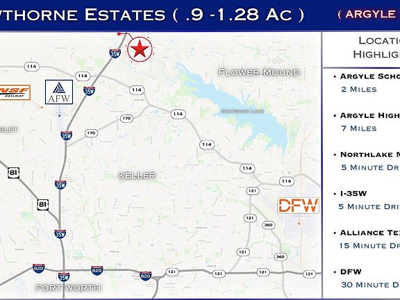 Discover the perfect blend of tranquility and convenience at Hawthorne Estates, Located at 880 Faught Rd, brand-new community nestled in the heart of Northlake, Texas. With 27 spacious lots ranging from .9 to 1.27 acres, this haven offers a peaceful and scenic retreat for homeowners.