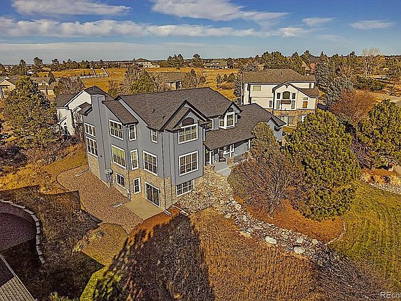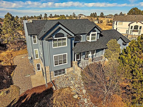 Located in the desirable Timbers community is a traditional/modern two-story home that is outfitted with a timeless grey color on the exterior. Situated on nearly 1/2 an acre, this two-story beauty is equipped with 4360 sq feet finished, 4 bedrooms and 5 bathrooms and a 3 car oversized garage. The garage has vaulted ceilings so a lift could easily fit. Welcoming homeowners is a charming covered front porch, and a grand foyer with heightened ceilings and a spiral staircase feature. The main level provides a dedicated study / office and living room off the foyer, and a great room with ceilings that reach up to the upper level. Decorated with large windows covering both levels and a floor to ceiling fireplace feature, the great room is a perfect place for gathering with friends or family. Opposite the great room is the open-concept kitchen that has a modern flair, with a spacious kitchen island, an eat-in space with access to the deck, and stainless steel appliances. With a computer nook, perfect for the kids to get their homework done, this kitchen provides a lot of storage and entertainment space. Heading to the upper level, homeowners will find the primary suite, that is complete with vaulted ceilings, a walk-in closet, and an expansive remodeled 5-piece spa bath, with dual vanities, a large soak tub, and modern finishes to complete the design. Completing the upper level is the other 3 bedrooms, two of which share a Jack and Jill bath and one ensuite. The lower level of the home provides homeowners with a finished basement that has walk-out access. With a large recreation room perfect for a theatre space or kids playroom, gym, and flex space, the basement has everything homeowners may need. The exterior is complete with a large entertainment composite deck to the landscaped backyard. Great location near parks, trails, horse facilities and easy access to grocery stores and I-25.