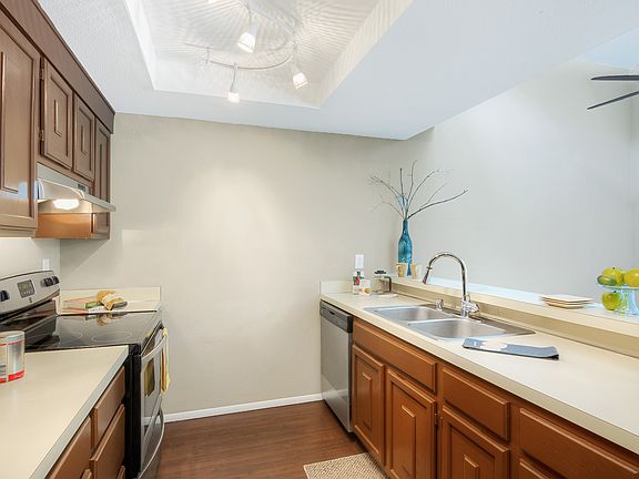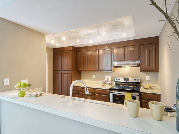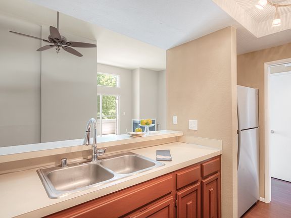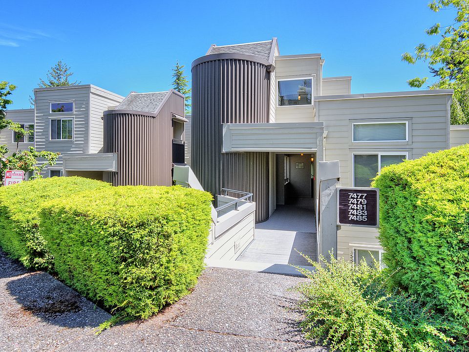 Light, bright top floor corner unit in desirable Knollwood offers quiet, convenient lifestyle. 2 Bed/1.5 Bath and 12' ceilings in living/dining room. Balcony adds privacy, inspiring views. Newly painted interior and cabinets. Dark laminate flooring. Kitchen has new stainless appliances. Large utility room for washer/dryer, storage. Private location shares only 1 common wall. Reserved parking steps away. Beautiful community pool, hot tub. Easy access to 520, restaurants, Marymoor Park, Microsoft!