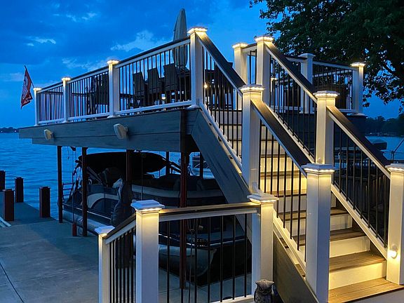 Stunning waterfront with panoramic views of Indian Lake!!! Allow us to open the door to this charming lake retreat. Spacious bedrooms and cathedral ceilings are just a few of the highlights of this breath taking property. An entertainer's dream kitchen has new quartz countertops and professional series Kitchen Aid 6 burner gas cook top and range hood. Outdoor features include new Trex Deck, with storage underneath and retractable awning, a covered boat dock with power lift and 2 power davit lifts. You can enjoy tremendous open water views from the top of the boat house with approximately 52 feet of sea wall. A 2.5 car attached garage allows for plenty storage for all of your lake toys. If you are wanting a perfect sunset view this home is for you! Don't wait! Schedule your private showing today!!