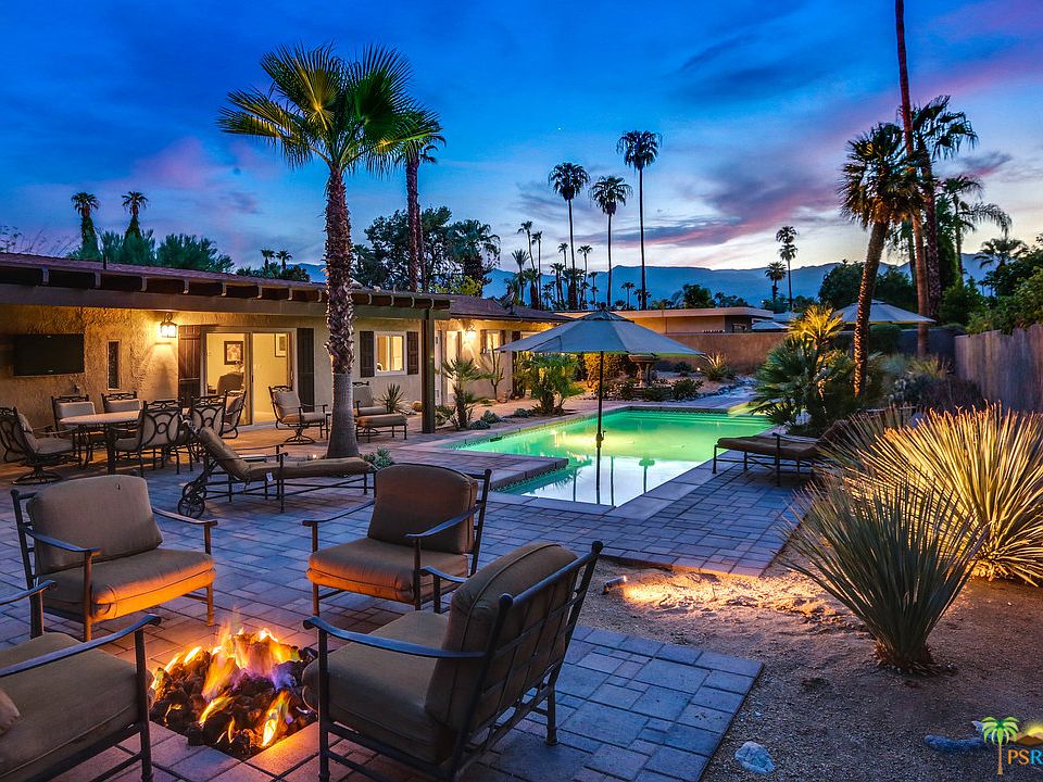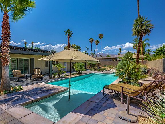 Beautiful 4 bedroom, 3 bathroom, contemporary ranch home located in the desirable south end of Palm Desert just minutes from El Paseo, Tennis Gardens and the Living Desert Zoo. Smartly upgraded, the additional 4th bedroom and 3rd bathroom make this home particularly unique if use in the vacation rental market. Large, energy efficient windows and sliding glass doors open to the back yard, pool and spa punctuate the indoor/outdoor lifestyle of the desert. Beautiful view of mature palm trees and surrounding mountains are unobstructed with no power lines. Multiple covered outdoor dining areas, gas fire pit with TV/audio set-up make this the perfect 24/7 entertaining home. All indoor/outdoor furniture and housewares are INCLUDED in the sale of this turn-key home!