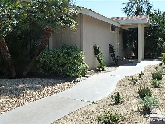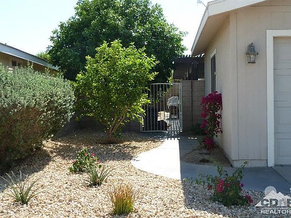 Charming split floor-plan Ivey Ranch home on a permanent 433 foundation. Master suite is at back of home with guest quarters at the front. Large and airy living room - dining area separates living room and kitchen. Low maintenance desert landscaping in front and back of home, with covered secluded patio perfect for barbequing or other outdoor entertaining. Back yard also has your own orange and lemon trees! Large master bedroom suite features spacious walk-in closet & bath with separate shower stall and sunken tub. Whole house is treated with a Culligan Water Softening system. The attached & finished direct-access 2-car garage has built-in cabinets and shelving, adding to the home's already ample storage space. Ivey Ranch features a PGA-rated 9-hole golf course, 4 community pools - one Olympic-size & heated - a Golf Pro Shop, Clubhouse, and so much more! Come and make this lovely house your home here in Ivey Ranch, the Coachella Valley's finest 55+ community, where YOU own the land!