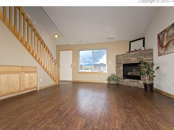 Absolutely tremendous 2001 home w/ stucco & stone accents. Fantastic views of Pikes Peak! Easy low maintenance property w/ small yard. All hard surfaces on main floor. Wonderful great room floor plan w/ large center island in kitchen! Beautiful corner fireplace in living room. Full Bath located on main floor! Stylish vaulted ceilings! 3 bedrooms upstairs w/ full bath! Home backs up to open space on side of the property. Two car garage w/ additional parking next to home.