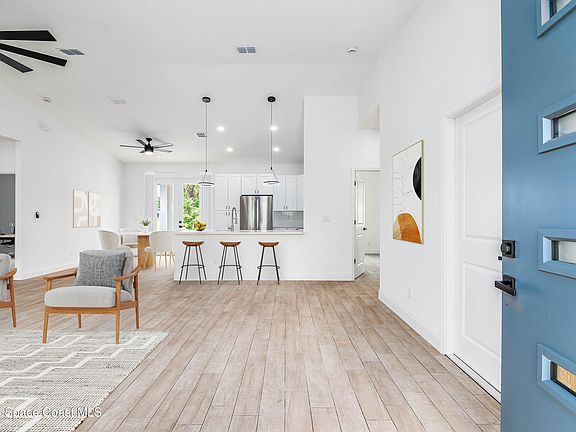 READY! This brand-new 2025 home in SW Palm Bay is just 2 minutes from Malabar Rd and close to shopping, grocery stores, and I-95. Built with premium hurricane-impact windows and doors, offering storm protection, energy efficiency, and lasting value. Inside, enjoy wood-look porcelain tile throughout and soaring 9'4'' vaulted ceilings in an open-concept layout. The kitchen takes center stage with quartz counters, subway tile backsplash, soft-close cabinets, pendant lighting over the breakfast bar, and recessed lights. The split floor plan offers a spacious primary suite with dual sinks, a glass-enclosed shower, and a convenient soap niche. Relax or entertain on the covered back porch. Additional features include a 2-car garage, whole-house water softener, and no HOA. Ideally located just 30 minutes from the best beaches in Brevard County—this is comfort, quality, and convenience all in one. Schedule your showing today!