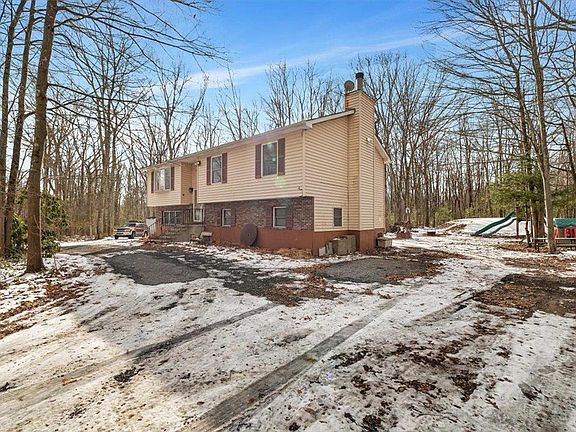 Spacious Bi-Level Home Offering 2,300 Sqft Of Living Space, 3 Bedrooms, 2 Baths & Finished Lower Level Showcasing Family Room w/ Fireplace & Bonus Rooms To Host Your Guests Or In-Laws! Situated On Flat 1.52 Acre Peaceful Tree-Lined Lot Providing Circular Driveway w/ Plenty Of Parking. Main Floor Offers Open Concept Living, Cathedral Ceilings & Eat-In Kitchen Featuring Custom Island w/ Bar-Top Seating. Versatile Floor Plan Awaits Your Finishing Touches But Upgrades Have Begun w/ Newer Flooring, Renovated Bathrooms & Custom Built-Ins Throughout. LOW Taxes Totaling Less Than $4,000/Year. Peaceful Pocono Countryside Highlighting Stocked Fishing Lake w/ Walking Path & Beach Area For Swimming Along w/ Beautiful Inground Pools For Your Summer Festivities! Priced To Sell As-Is. Make It Your Own!