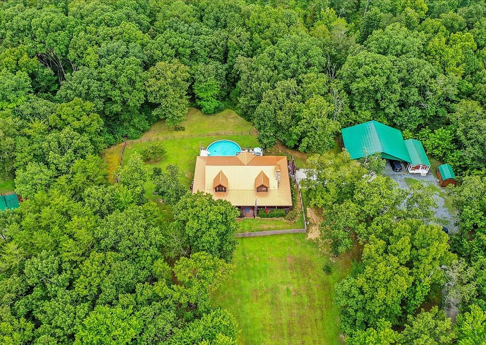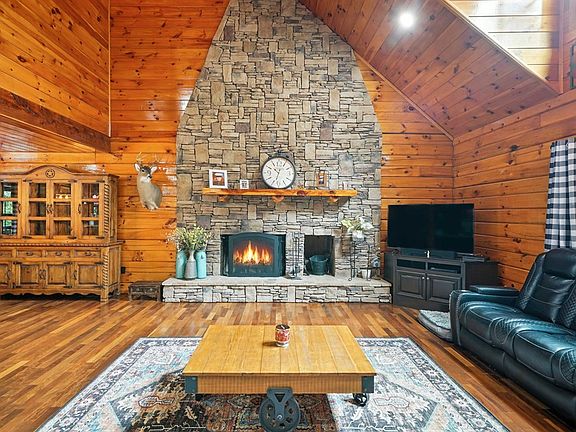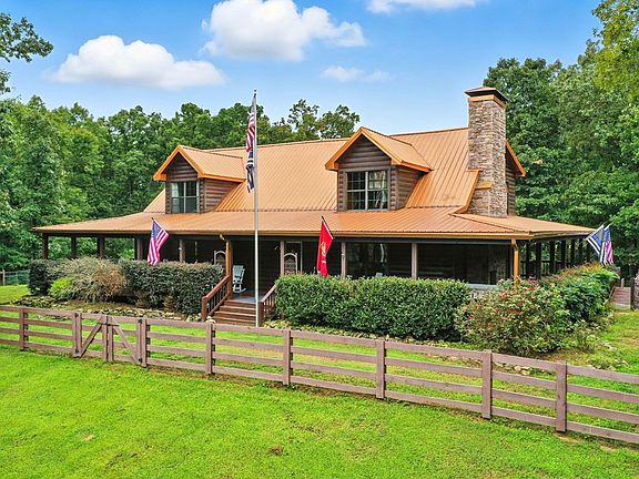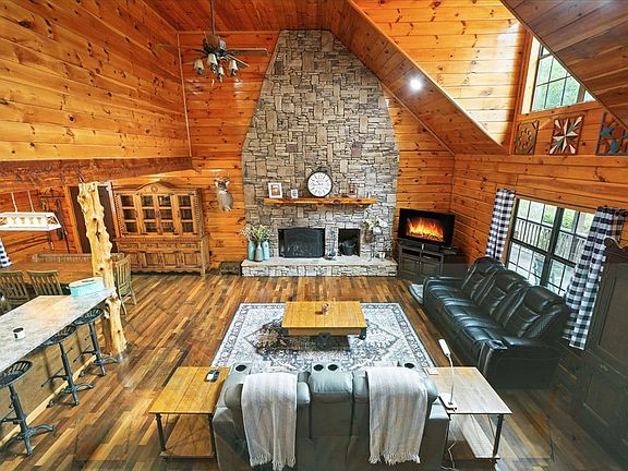 Nestled on almost 9 gently rolling acres just minutes from downtown Chatsworth, this custom-built log home offers comfort, character, and a serene North Georgia setting. Inside, the two-story great room welcomes you with a floor-to-ceiling stone fireplace, vaulted ceilings, and an open layout perfect for family gatherings. The kitchen features solid wood cabinetry, stainless steel appliances, an island with striking Utah-imported pillars, and seamless flow into the dining area. The main-level primary suite includes a walk-in closet and a beautifully tiled walk-in shower. Upstairs, two additional bedrooms, a full bath, and a flexible loft—complete with an upper deck—provide plenty of space. A sprawling wraparound porch leads to an above-ground pool for summer fun, while the property's newly finished outbuilding serves as an ideal workshop, hobby space, or chill cave. Recent updates include a new roof for peace of mind. The large pole barn is perfect for RV or boat storage, and a tranquil babbling brook runs along the back of the property. With no HOA, plenty of usable land, and easy access to schools, shopping, and outdoor recreation, this move-in ready property offers the perfect blend of privacy and convenience. Schedule your showing today—acreage, charm, and updates like this are hard to find!