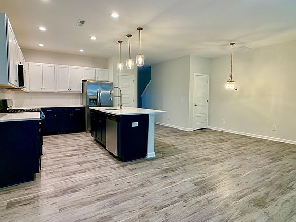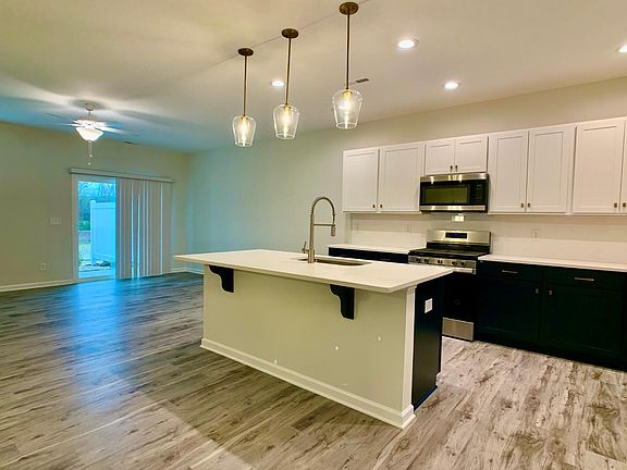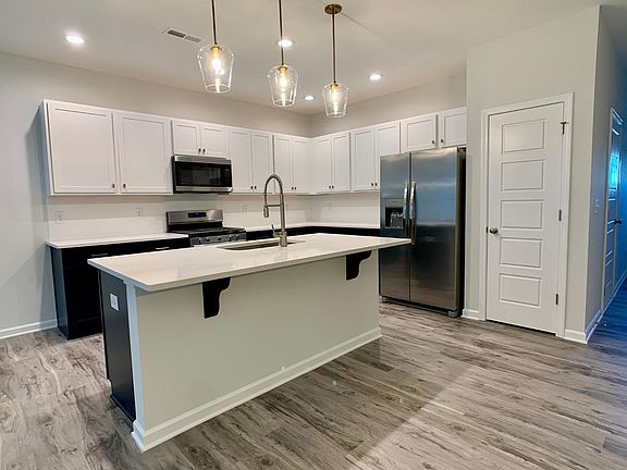 Townhome in Barrington SD, Zebulon. Three Bedrooms 2 1/2 bath with 1 car garage ready for move-in There is a gas fireplace in the den area with a mantel and slider to the rear patio. The kitchen has granite countertops, custom cabinets, and stainless appliances, which include a gas range. The center island has a breakfast bar and pantry. Primary has tray ceiling, walk-in closet, dual vanity, and linen closet. Lawn care is included in the rent. Community Pool is open during the summer. Convenient to shopping, 264, and 87.
