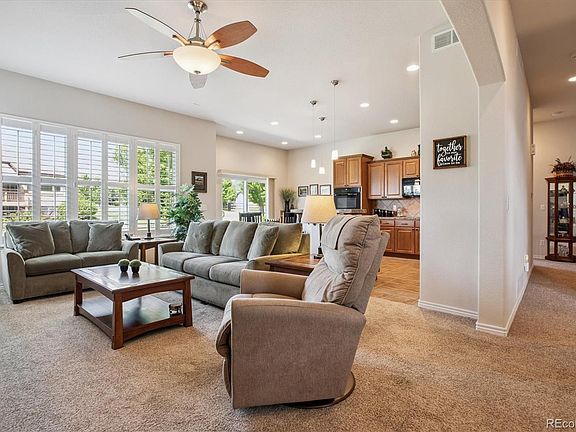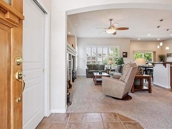 Backing to the community greenbelt, this meticulously maintained ranch style patio home in Saddle Brook offers main floor living and is move-in ready! If you’re looking to leave the lawn care and snow removal to someone else and just enjoy your free time, this is the home for you! The open floor plan boasts high ceilings and tons of natural light. The kitchen is beautiful with granite tile countertops, sleek black appliances, an island with bar seating, and tile floors & backsplash. The great room has a gas fireplace and built-in shelving. The bonus room would make a great living room, dining room, or home office. The spacious primary bedroom suite overlooks the greenbelt and has a walk-in closet with built-ins and a 5-piece bath with jetted tub and walk-in shower. A guest bedroom, full bath, and the laundry room with built-in cabinetry and washer & dryer complete the main floor layout. The basement has moveable partitions installed but is otherwise unfinished and is ready for your custom finishing touches. The 10x10 west-facing patio backs to the greenbelt and has a power retractable awning with storm sensor. Enjoy gorgeous mountain views while relaxing outdoors! 420 sqft, 2 car attached garage. New furnace and A/C in 2024. New water heater in 2022. Plantation shutters. You'll find miles of walking & biking trails, parks, the Arvada Indoor Equestrian Center, and West Woods Golf Club all nearby. This is maintenance free living at its best!