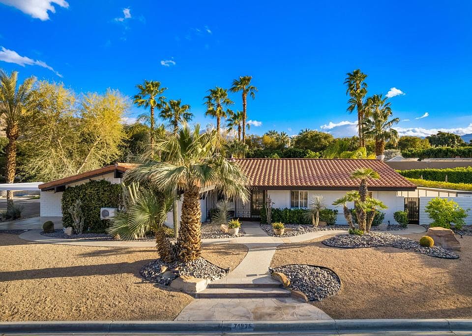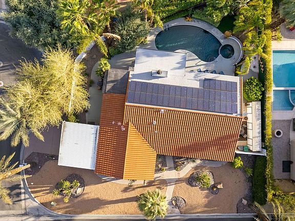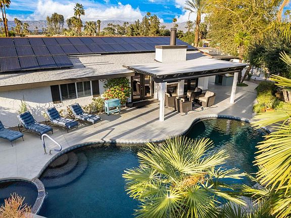 Retreat to this South Palm Desert home near the border of Indian Wells and the Vintage Country Club. Lush landscaping surrounds the private saltwater pebble finish pool and spa. Entertain outdoors under the covered patio with double sided fireplace, dining area and built-in bbq. Spacious indoor living area with vaulted ceilings, updated kitchen and an open floor plan featuring multiple French doors to the patio and pool area. Indoor and outdoor built-in sound system and TV's. Vaulted ceilings continue in the primary suite with updated bathroom and walk-in closet. Guest suite and 3rd bedroom currently built out as a well appointed home office. Enjoy energy savings with the 44 panel owned solar system. Driveway, carport and climate controlled garage off of a small cul-de-sac shared by only one other driveway. Conveniently located between El Paseo and Indian Wells Village retail. Come home to your private oasis!