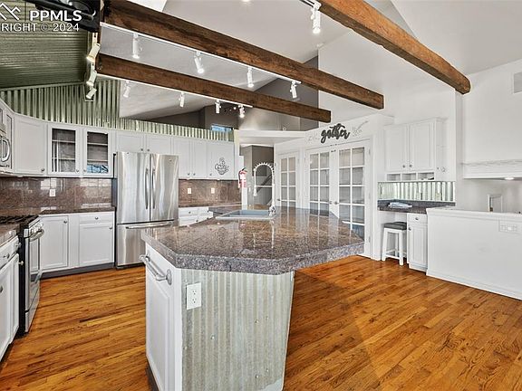 Welcome to this stunning 5-bedroom, 3-bathroom home featuring breathtaking mountain views from the main level and back deck. This unique residence is adorned with modern farmhouse updates, including beamed ceilings, cozy gas fireplace, skylights, and wood floors on the main level. An attic fan helps cool the house on warm summer days. The kitchen is a chef's delight with stainless steel appliance, gas stove and a large island, perfect for meal prep and gatherings. Located in the desirable School District 20, the home offers convenient proximity to shops, restaurants, and everything you need. The private backyard is an outdoor oasis with a hot tub, a useful storage shed, and multiple decks, including one off the master bedroom, perfect for relaxation and entertainment. There is also an additional parking space in front of the storage shed. The home's unique design is further enhanced by a charming front patio. Combining modern amenities with farmhouse charm, this home is a must-see!