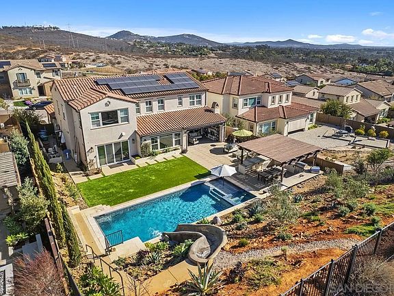 Experience ultimate Southern California coastal elegance in this breathtaking 2016-built home, offering panoramic ocean views and situated in the coveted Southern Preserve. Designed for the ultimate in entertaining, this 5-bedroom residence includes a versatile ADU studio perfect for rental income, 4.5 bathrooms, an office, and a spacious loft. The thoughtfully planned layout features a main-floor secondary primary suite with a full bath and private office, ideal for remote work or creative pursuits. Upstairs are three additional bedrooms, a large loft, and abundant natural light. Custom paint and designer wallpapers elevate the open-concept living spaces. The expansive 14,500+ sq. ft. lot is an ultimate outdoor sanctuary, featuring a built-in BBQ, bar, mood lighting, and two fireplaces—perfect for hosting or unwinding. A covered loggia offers the ideal setting for alfresco dining, while the sparkling pool, hot tub, and slide provide ultimate entertainment. Revel in sweeping ocean vistas from the highest point of the property, creating an extraordinary backdrop for any event. The vast yard, surrounded by lush landscaping and fruit trees, offers a peaceful retreat for children, pets, and family gatherings. Additional features include a 9000w solar panel system with inverter and battery backup, enhancing energy efficiency. This home flawlessly combines ultimate luxury with practical family living, offering both everyday comfort and an unparalleled setting for entertaining.