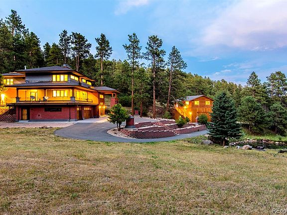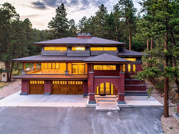Custom remodeled estate quietly tucked in the trees with easy access to daily amenities, high performing schools, Denver and the Colorado high country. Impressive architecture inspired by the designs of Frank Lloyd Wright and thoughtfully positioned on 10 gentle acres with a pond, meadow, forest and mountain views. Frank Lloyd Wright's visionary creations were greatly influenced by the natural world and the open floor plan, abundant windows, decks and covered wrap-around porch highlight the native setting for this one of a kind custom home. The open floor plan offers ease for everyday living and entertaining while the bedroom spaces are quiet and private. Intricate detailing includes exposed brick walls, sweeping central staircase made of African Mahogany and tailored iron rails, spacious kitchen with quality stainless appliances, lavish master suite with a remodeled bath and steam shower, high ceilings, tons of windows for natural light, new durable tile floors with a polished finish, beveled glass, main level reading balcony, remodeled bathrooms, heated concrete apron at the entry and by the garage, excellent outdoor living options and an overall contemporary feel. The large entry introduces the central staircase that reaches all three levels. A media room, work-out/office space, garage entry and a 3/4 bath complete the entry level. One level up is the main living space with the kitchen, dining room, breakfast nook, living room, family room, wrap-around porch and deck access, two bedrooms, full bath and a "bridge" reading space. The upper level houses the master retreat and a large secondary suite. The detached two story building and shed is 2,171 square feet with heat and electricity creating an ideal environment for extra garage space, a barn, workshop, studio etc. The level ground around the detached building offers options for extra vehicle, trailer, camper or RV parking. The gentle land, meadow and pond are hard to find in the foothills.