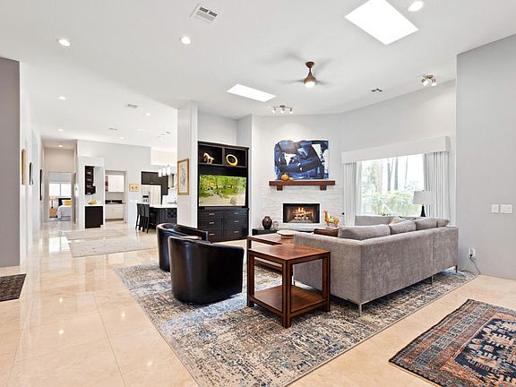 Welcome to The Cove in Indian Wells, a highly coveted gated community in a premium location. This beautifully updated home, with gorgeous mountain views in all directions, has an open floor plan with vaulted ceilings, travertine floors, stacked stone fireplace, custom lighting and much more. The primary bedroom suite is custom with a stand alone tub, large tiled shower, and two extra-large walk-in closets. The chef's kitchen features a large island with bar seating, SS appliances, a wine refrigerator, high end cabinetry, a large pantry and more. There's a gorgeous dining room, as well as a large bonus room that could be used for an office, family room, or library, plus two large guest bedrooms with a jack-and-jill bath. Ample parking leading into your 2 car garage, and there's a second garage that can fit a 43' RV, complete with hook ups and AC system. Off the second garage there's a large storage/tool room. Soak up the sunshine in your backyard oasis featuring a private pebble tec pool/spa with cascading water feature. Additional features of this home include motorized window coverings, new LED lighting and carpet, custom built ins, ample storage, shutters, and much more. As an Indian Wells resident, you enjoy the perks of discounted golf, exclusive city sponsored events, rear yard trash service, and discounts at the four Indian Wells resorts and more. And the HOA fees are only $100 a month.