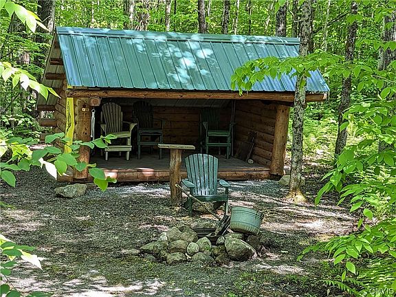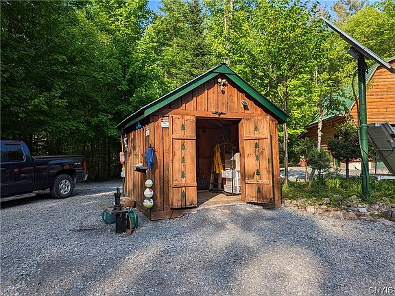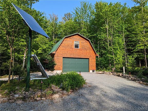 Come check out this beautiful cabin in the woods located on a plowed road with direct access to ATV trails & nearby access to snowmobile trails. Owners have taken great care in maintaining this home, which features a log cabin with great room, full bath and one bedroom on the first floor. Second floor is open to another large bedroom. Outside is a storage shed with enclosed space behind, which is currently used as a picnic area, but could be guest sleeping. Also included is a storage shed housing the solar panel electronics and the generator. By the road is a lean-to, built in boy scout style with a cookout area. Guest or renters could utilize this area. And last is the massive 2-car garage with overhead storage. All this is located on almost 6 acres of land and if that's not enough, there are 1000s of acres of State land within 1/4 mile. Sit on your covered front porch and enjoy all nature has to offer.