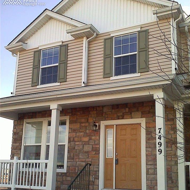 This FORMER MODEL, END UNIT townhome is just right for your new home or as an investment! Walk in from the great front porch to the open living room/dining room combo with high ceiling. Awesome tile throughout the main level leads to the good-sized eat-in kitchen which boasts a counter bar, pantry, laundry access and walkout to the back yard. Great master has vaulted ceiling, walk-in closet and adjoining full bath. The other big, bright bedroom has its own bath PLUS there's an extra bonus room/loft - perfect for an office. Close to Ft. Carson, Metcalfe Park, schools, parks & I-25. Upgrades include whole house humidifier, A/C, 6 panel doors, custom window coverings, special wall coverings, ceiling fans, and rounded corners. All kitchen appliances are included: dishwasher, range-oven, built-in microwave, and refrigerator w/ice-maker!