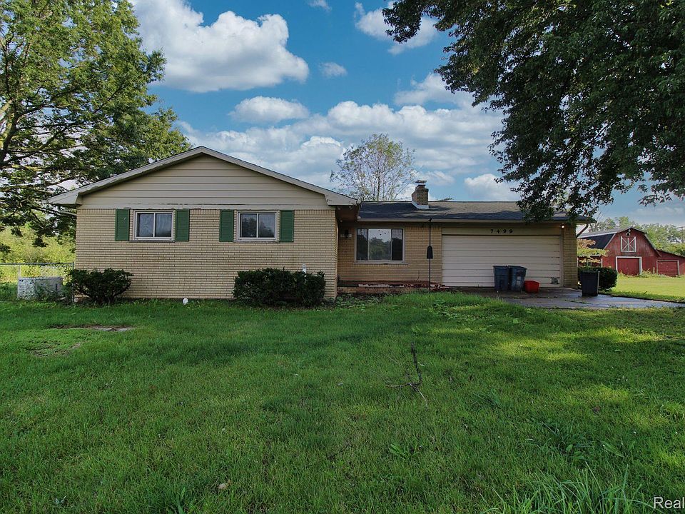 Great ranch home on the classic 5 acres with 330 frontage, 25 x 30 barn with cement floor and walk up loft, beautiful pond, beautiful multi level deck over looking your property. Door wall from master bedroom, and living room. LARGE rooms, partially finished basement. Island kitchen, fireplace in dining/family room. This home needs some TLC and master bath needs finishing. Seller has already adjusted for improvements from anticipated "improved" value. Natural Gas and City Water at the street.