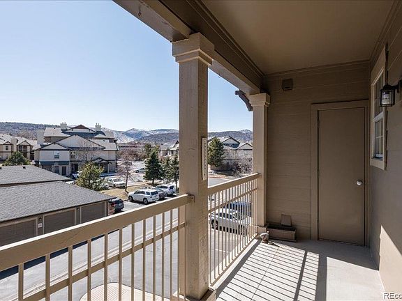 Beautiful, impeccably maintained 3rd floor condo in the highly desirable Fallingwater community. Unit is west facing with amazing mountain views! Natural light pours in through the sliding glass door creating a warm and welcoming feeling. Living room and dining room are graced by crown molding and 810 ceiling. Bright kitchen features wood style flooring, attractive white cabinets, extensive counter space + pantry. All GE kitchen appliances included + GE washer & dryer. Handy breakfast bar nicely accommodates 2 bar stools. Built-in desk area has great lighting, built-in cabinets & drawer - perfect for todays remote working. Generous sized bedroom has a ceiling fan light fixture & walk-in closet. Custom closet system by Closets by Design maximizes the storage capacity. Huge bathroom with extensive counter space, several drawers and linen closet. Newer carpet & 6 panel doors. Enjoy watching colorful Colorado sunsets from the west facing windows and balcony. Extra deep one car detached garage + reserved parking space in front of garage. Garage offers invaluable additional storage space - built-in cabinets and 410 x 311 niche which is perfect for storing luggage, skis, bike, etc. Fallingwater is a special place to call home. This gated community is beautifully maintained and offers many amenities, including outdoor pool + hot tub, clubhouse with outdoor grill & fitness room. Ideally located near C-470, shopping, restaurants and miles of trails and bike paths. Don't miss this one!