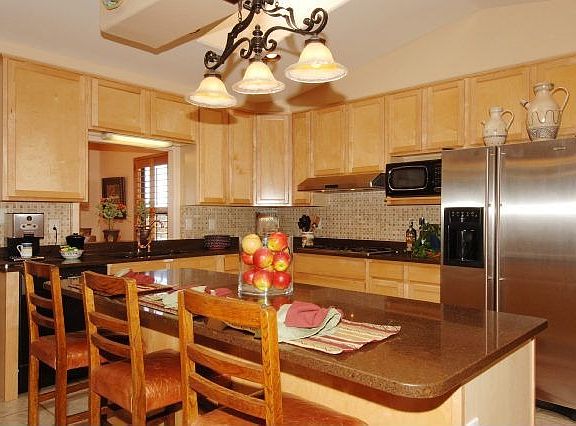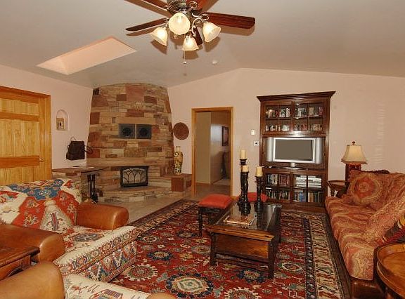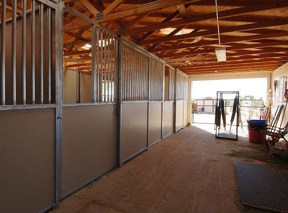 Gallop and be gourmet on 10 acres in the Los Caballos horse community just 18 minutes southeast of Santa Fe in the Eldorado/US-285 area. The pitched-roof ranch-style 2772 +/- sq ft, 3 BR, 3 BA home features a large Great Room with stone-faced fireplace, tile flooring and doorway opening out to a flagstone patio and portal. All overlook the rolling high desert terrain and glimpse the horse facilities. At the center of the residence is the splendid kitchen with granite countertops, 5 burner Jenn-Air cook-top and Jenn-air double wall ovens, large center island with breakfast bar, pantry and abundant cabinets and storage. Open to the Great Room, there is also a pass-through to the breakfast room. The formal dining room is nearby making the logistics of entertaining easy. The house has 2 comfortably sized master suites, each with recently remodeled baths and walk in closets. The master suite farthest from the Great Room would also work well as independent guest quarters or mother-in-law quarters.