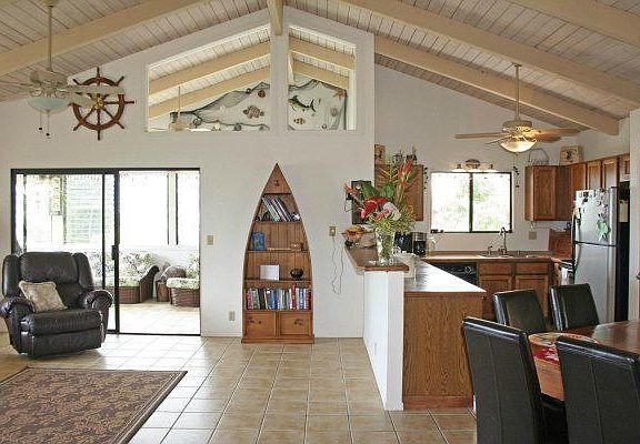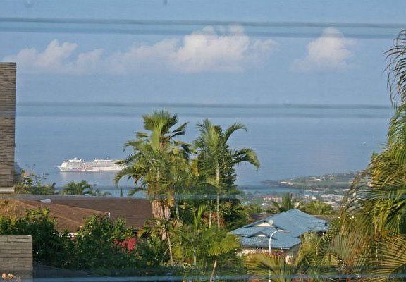 View the cruise ships in the bay from 4bd/3bath home located in Holualoa School District. Underground electric, centrally located near downtown yet residential. Minutes away from shopping, dining and beaches. Lovely tree lined neighborhood without that cookie cutter subdivision feel! Makai entry leads to high vaulted ceilings with spacious open living room/dining kitchen. Home consists of around 1948 SF with approximately 1276 upstairs with a 272 SF enclosed porch and ocean views.Tile floors upstairs, tropical fans throughout. Oranges, tangelo, lemon, pineapple, papaya, mango, apple bananas and avocado trees in yard. Master bedroom has walk in shower and walk in closet. Covered 2 car parking with paved driveway going up from street. 672 SF finished bedroom/living areas guest area features 2 separate entrances from garage or side yard. In the rear of home is a 176 (unfinished) basement area which has been converted to a bar/card room (man cave) with (unpermitted) tiki bar outside. Temporary storage shed may go with sale at buyers options.Wonderful family home which would give multi generations living in same home private spaces. Furnishing optional. Sunday viewings encouraged. Weekday viewings need 24 hour notice.
