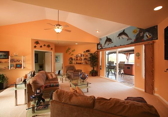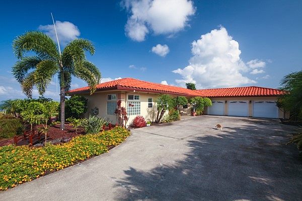 Custom home. Gourmet kitchen with granite counters, bullnose ends. 9 Ft. Ceilings throughout with vaulted living room. Billiards room with custom table and furniture. Incredible home theater system throughout entire house. Every room has in-ceiling speakers incl. lanai, garage and bathroom. Elaborate glass block in master bath along with jacuzzi tub and Italian travertine flooring. Master has custom closet by California closets that boats 17 ft of hanging space. Living room has an authentic "Rockwood" ocean mural on the wall approx. 14 ft by 4 ft. Huge 3D LCD flatscreen TV in living room on custom swiveling mount, huge flatscreen TV in master bedroom on custom swiveling mount. Large 8 person jacuzzi on patio beneath a gazebo with ceiling fan/light. Food prep station on patio with a sink and granite counter top. Extensive professional landscaping which includes rock walls and many specimen trees like Pygmy Date palms, fruit trees incl. lemon, lime, tangerine, pink grapefruit, naval oranges, cacao trees (chocolate), mango, banana, vanilla, pineapples, raspberry, dragonfruit and more on the nearly 1/2 acre. Very little automobile traffic, home close to lower subdivision border and is NOT a thru street.