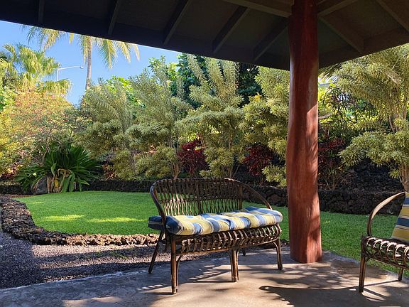 Located in stunning hillside Pualani neighborhood, this is a wonderful home base for your Big Island adventure. Move-in ready, fully furnished with beautiful modern furniture, three bedrooms (2 Cal King, 1 Queen) each with private ensuite bathrooms. Primary bathroom includes a jet tub, and showers have natural rock floor. Main top floor looks out Kailua Bay and downtown Kona with sweeping Pacific Ocean views. The 600ft elevation level provides the perfect combination of warm sun and cool breeze. The whole house, including 3 AC units, are fully powered by roof solar panels with 3x Tesla battery backup for the whole house: you will be self-sufficient for electricity even if the grid goes down. Gas stove top, modern appliances, espresso machine, stand mixer, additional fridge/freezer in the garage. Living room converts to a theater, equipped with 125" automatic screen and 4K projector. Herman-Miller office chair and private office is WFH ready with fiber internet included. Outdoor entertaining lanai has access from three doors: both top floor bedrooms and the living room, out to the gas grill and long dining table. Modern stylish lounge seating on the lanai is great for enjoying quiet mornings and stunning sunsets. Two car garage equipped with NACS EV charger, and one additional parking spot in the private driveway. Garden includes many types of fruit for you to enjoy year-round: coconut, tangerine, lychee, lemon, orange, pomelo, mango, avocado and even your own private line of 10 Kona coffee trees to harvest. The monthly list price + General Excise Tax (4.5%) is paid by renters. All-inclusive of utilities and maintenance: - Bi-Weekly Yard Maintenance - Weekly Garbage service - Water - Gas (Propane stove and water heating) - Electricity (solar) - Fiber internet Security deposit and first month's rent due at signing. Zillow common applications accepted. No smoking, small pets allowed, 2 car garage and driveway parking, no street parking.