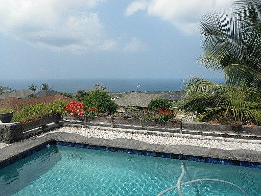 What a great ocean view! Great location at the top of this popular subdivision. Come home to island lifestyle and enjoy splashing in the Gunite, salt water pool. Energy wise you have solar hot water, solar for the pool and photovoltaic. Sip a cool soda while lounging on the covered lanai. Kitchen has Corian Countertops and even has a breakfast room. Enjoy the comfort of central air conditioning. No stairs because living is all on one level. The fenced yard has colorful gardens that are a treat to the eye. Room for your orchids and gardening.