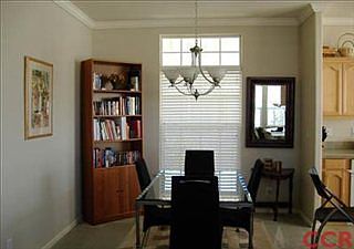 A Silvercrest manufactured 2006 home, 9 foot ceilings, crown molding throughout and ceiling fans 27'x56 approximately 1442 sq ft and in pristine condition. Includes 2 bedrooms and a DEN/OFFICE with double French doors. The kitchen has a Celestry & bay windows, maple cabinets, roll-out drawers, tile flooring and Corian countertops. Eat in kitchen as well as a breakfast bar.Living room has a gas fireplace w/gas starter. A very private back yard with shed. The home includes washer,dryer refrigerator and has A/C. This is a well-maintained home featuring premium landscaping. A delight to show.