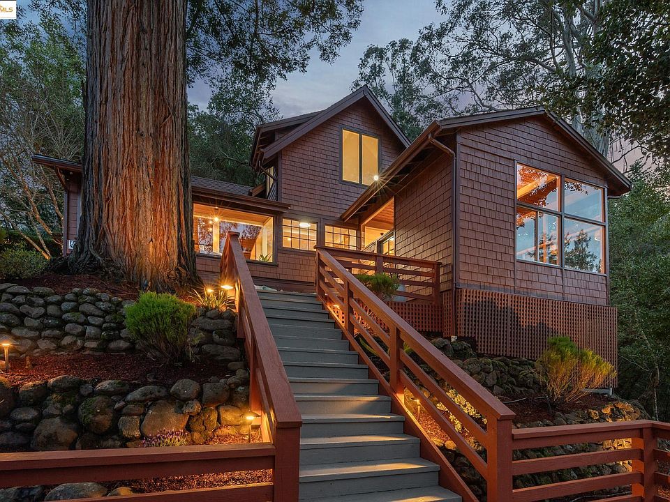 Nestled in a serene, woodsy setting, this enchanting 3-bedroom, 2-bath home offers a private retreat on over an acre in Orinda. Surrounded by majestic redwoods and a picturesque creek, this secluded property sits at the end of a quiet road, with a long driveway leading to a one-of-a-kind residence. Inside, the home exudes rustic elegance with beautifully remodeled interiors, gleaming hardwood floors, and a warm, cabin-like charm. The inviting living room features a striking stone fireplace, beamed wood ceilings, and large windows framing lush natural views. The chef’s kitchen blends modern convenience with rustic style, boasting high-end finishes, a wine fridge, cozy breakfast nook, and ample cabinetry. The expansive primary suite spans the upper-level w/vaulted ceilings, an en-suite bath, generous closet space, and treetop views. Two main-level bedrooms and a full bath offer comfort for family or guests. Outside, terraced yards, landscape lighting, and multiple patios create inviting spaces for relaxation and entertaining. Despite its tranquility, this incredible retreat is just a short stroll to top-rated Wagner Ranch Elementary School, downtown Orinda’s shops, restaurants, and BART, offering the perfect blend of seclusion & convenience. Don’t miss this rare opportunity!