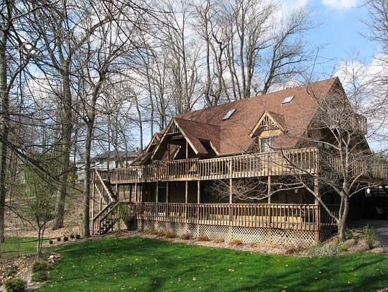 Tucked into a wooded ravine, this extraordinary A-frame boasts over 1500 sf. of decking on three levels from which to enjoy this wooded wonderland and seasonally the meandering creek. The open concept interior showcases wood beamed ceilings, 1 x 12 white pine wide plank flooring, a beautifully crafted, centrally located, oak staircase, 6 panel hardwood doors and rustic cedar trim, 2 fireplaces, plus plenty of natural light from Andersen windows and the 6 sets of French doors that allow easy a...