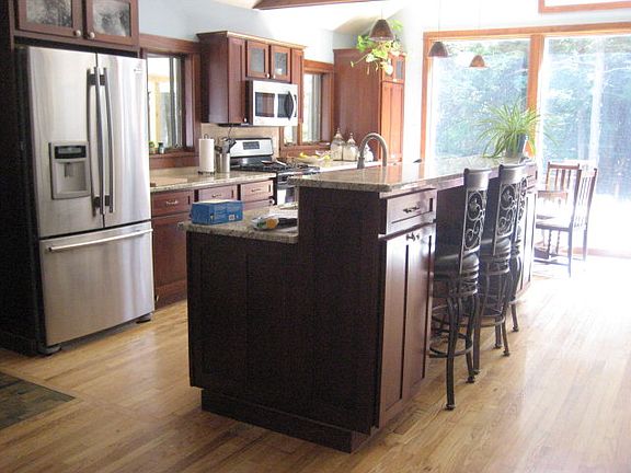 Residential, Adirondack - Saranac Lake, NY Cathedral ceiling in bright Great Room which includes new kitchen with stainless steel appliances and granite counters, living room. Additional space in basement could be finished for another bedroom or family room. Lovely park-like setting. 3 sources of heat: oil-fired hot water radiators, hot air wood furnace or the pellet stove in the great room. One-car garage in basement and oversized one-car detached garage.