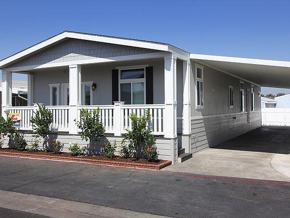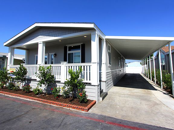 Welcome to 75 Cherry located in the Rancho La Paz Mobile Senior Home Community in Anaheim California. Upon first glance one notices the Colonial architecture reminiscent of stately homes in the northeast and antebellum south. A brick bordered planter in front accommodates four dwarf citrus trees grafted to bear Valencia and Washington navel oranges as well as tangelos, limes and two types of lemons, providing the homeowner with a host of cooking and snacking options. Also in the planter are eight hybrid- tea roses, to offer the owner beautiful and fragrant bouquets throughout the house. The full length front porch with its weather resistant clamshell grey decking is perfect for that morning cup of coffee or sunset glass of wine to celebrate the day. Entering the full-sized light emitting glass door one is drawn to the high ceilinged, open concept floor plan with plenty of room for entertaining friends and family. To the right the eye is drawn to the epicurean sized kitchen and sitting area. A large working island with fluted columns abundant storage, modern brushed nickel pendant lights with frosted glass and is topped with beautiful swirling Viscount White, a bull nosed granite counter as is the rest of the kitchen counters. Ample craftsman shaker white cabinets with hidden finger pulls remove the need for hardware and give a sleek modern feel throughout. A suite of chef series stainless steel Samsung appliances will make meal preparation and cleanup a breeze. Adjacent to the kitchen is the laundry room with room for a full size stack washer and dryer as well as a cabinet and countertop matching the kitchen. The laundry room has oversized Carrera marble inspired porcelain tiles on the floor to match what is found in the restrooms. Coming back into the great room the eyes are first drawn to the 9 foot coffered ceilings and cased framed transom window sets throughout which add much more light and openness. Bullnose corners soften the transitions from space to space and the grey timberline architectured flooring gives the home both grey’s and traditional browns to match the widest collection of furnishings. To the right is an open arched entrance to what can be a formal dining room, a home office, den or third bedroom. Into the hallway and to the left is the guest bath with Carrera Marble countertops on a vanity with the white shaker cabinets. Chrome and brushed nickel fixtures accent the shower, and sink. To the right is the large guest bedroom with abundant closet space and a ceiling mounted hunter ceiling fan. The master bedroom offers an extremely large closet and both ceiling fan and a large master bath with Carrera marble countertops, dual sinks, matching porcelain tiles and plenty of cabinet space. The full size shower features classic white subway tile to bright that space even more. Returning to the master bedroom the eyes are drawn to the light filled double French window doors, that open up onto the fenced, landscaped rear patio, that is perfect for your chaise lounges, barbeques and even possible a gazebo. To the right is a massive carport that is 65 feet long and 12 feet high and bordered by a newly planted row of podocarpus hedges that will soon provide privacy on this side of the house and is matched on the other side as well. The carport can conservatively accommodate four cars or two cars, a storage shed and an outdoor sitting area as well. 75 Cherry is proof of the strides made in manufactured housing and comes with a seven year warranty insuring your peace of mind. This amazing home will afford you comfort, elegance and happiness at a fraction of the cost of site built homes. A home like this with the land could be over one million dollars depending on the location however 75 Cherry can be yours for $250,000.00 Contact John Nolan of Realty One Group at 1-800-NEW HOME Or john@home-works.net