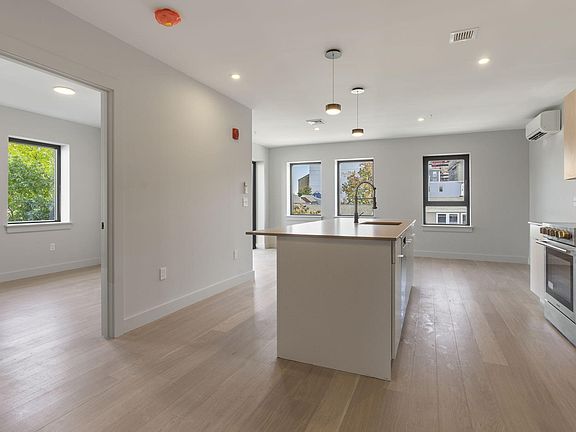 This 2 bedroom unit has an open concept living area, a kitchen with island, a balcony, tons of light and city views.