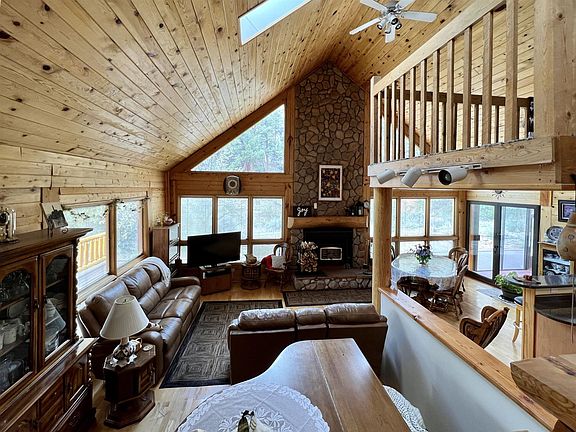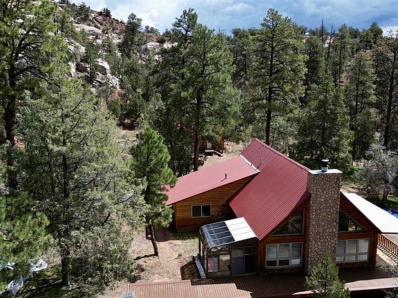A hidden gem in a breathtaking location! Secluded loft style cabin on 12.5 heavily wooded acres in Timberlake Ranch. At the end of a cul-de-sac, with incredible views of the colorful towering cliffs rising behind the house. A covered porch runs the length of the front, with an open deck along the side of the house facing the cliffs. A sunroom provides a warm place to enjoy nature in the winter. House has an oversized studio/utility room and a room that could serve as an office, study, or fourth bedroom. Detached 20x16' workshop with 19'x27' covered parking/storage. Timberlake Ranch offers HOA-maintained roads, private Ramah Lake access, equestrian trails, and a friendly and helpful community. Volunteer fire dept/EMS less than three miles away.
