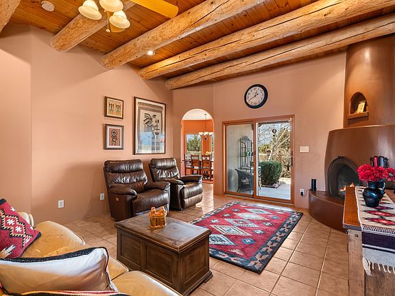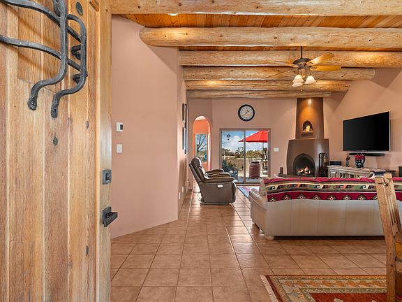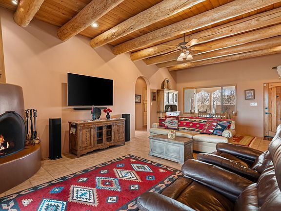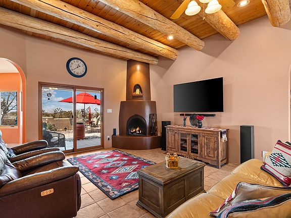 TALK ABOUT HAVING IT ALL!! This Eldorado beauty has wonderful mountain views and extraordinary outdoor spaces with hot tub, roof-top deck, built-in bar and BBQ, kiva fireplace, sun shades and a number of entertaining and seating options and a Bocce Ball court!. Kitchen features under cabinet lighting, hickory cabinetry, great storage, stainless appliances (range has never been used) and built-in desk area. Walk-in pantry has exceptional shelving and room for small appliances. Primary bedroom has viga ceilings, kiva fireplace and doors to rear portal and a library/media room/office is attached. A cedar closet and generous walk-in closet with drawers and shelves. Primary bath has double sinks, large jetted tub and separate shower. Silicone coating on roof in 2021 - six years left on the transferrable warranty. Single-level, no interior steps, in-floor natural gas radiant heat and two evaporative coolers. Sellers use Xfinity for internet. Eye On Water leak detection system through the Eldorado Water Dept. Whole house water filtration. Oversized, finished 2-car garage with overhead storage and lots of cabinets. Heated RV garage is 15 x 40 with 16' ceiling. Three kiva fireplaces. Proper laundry room with abundant storage. ADT alarm system is transferrable. Some outdoor furnishings are conveying with the property. LIST OF IMPROVEMENTS IN SUPPLEMENTS.