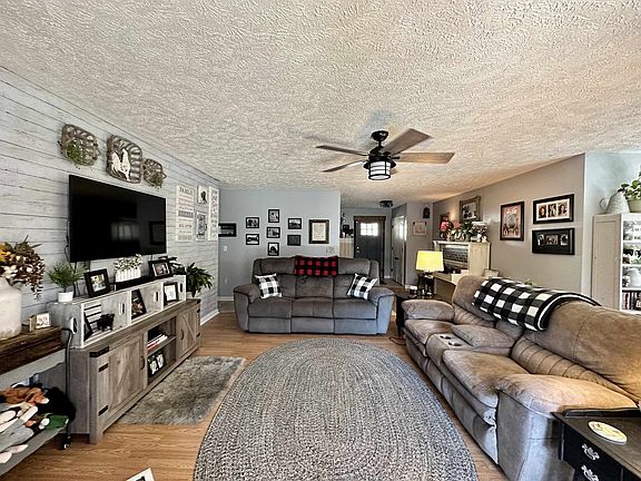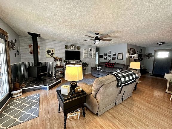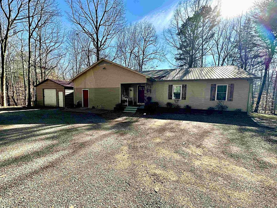Peaceful Country Setting! This 3BR/2BA home features an open floorpan, wood burning fireplace in the living room, large tile shower in the primary bath & bonus room w/large storage room. Enjoy your morning coffee on the covered back deck that over looks a large pond & watch the wildlife out on your 16.5+/- wooded acres. Chicken coops & 2 outbuildings included. No restrictions!