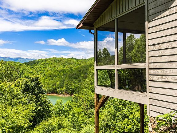 On the banks of an emerald cove in gated Fontana Lake Estates is this turnkey home offering casual elegance with stunning, treetop views of Fontana Lake & the Nat'l Park. The spacious rooms are flooded with natural light shining through the peaked windows with captivating views from every room. The rustic exterior is wood & stone blending perfectly with the natural surroundings, sitting on a private 4 ac lot at the end of Eagles Way. The main level offers a great room with a vaulted ceiling centered around one of the woodburning FP's with plenty of kitchen storage, induction stove & a wet bar with a wine cooler. The Master Suite also has a FP, walks out to the deck & has an ensuite bath, jet tub, walk-in closet, tiled shower. The 2nd BR, bath & laundry are off the kitchen, as is the inviting screened porch with lake views walking out to a huge deck & covered grilling area. The lower level has another living area overlooking a large patio & grassy yard. This protected wilderness community was designed to complement the beauty of the natural environment & provide a luxurious lakefront lifestyle with a marina, hiking trails & day docks with gazebos for your enjoyment. Move-in ready!