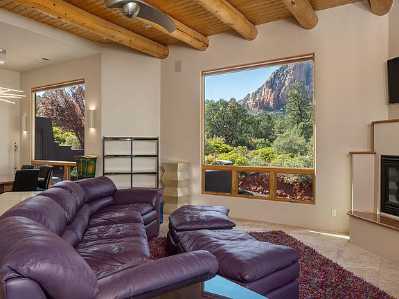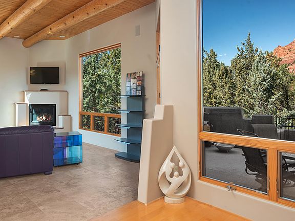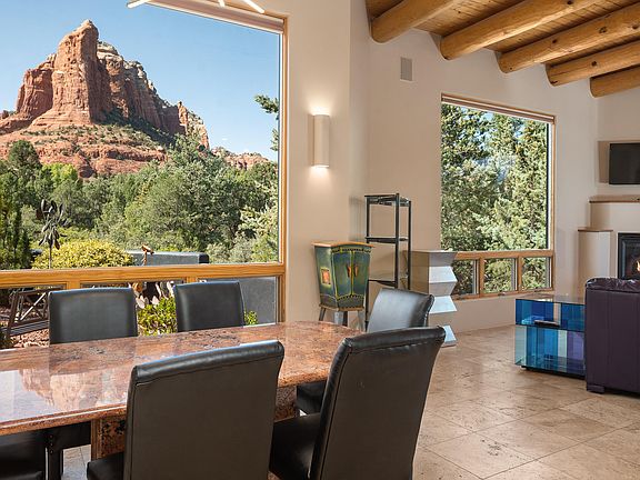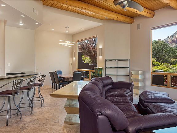 Modern home on estate lot in established exclusive Soldiers Pass neighborhood, this home is nestled between the Pinon trees off a private road for the ultimate getaway. Surrounded by Sedona's finest homes, this designer home offers an unusual combination of privacy and direct red rock views not often found in the area. Main level floorplan is centered on the modern kitchen, massive living room,and walk out patio with soaring ceilings to capture views and welcome guests. This fine residence (in arguably the best neighborhood in town!) offers four bedrooms, two offices, game room, a full home theater, and amazing outdoor living space. There's a Pebble-Tek pool and spa for Sedona's extended summer season, as well as a sport court/Pickleball court to stay active.