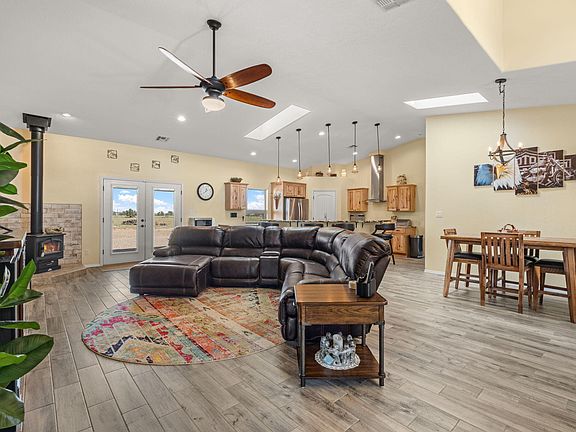 Set on an acre with sweeping views of the South Mountains, this 4 bedroom home truly has it all. The kitchen features granite countertops, knotty hickory cabinetry with pull-outs, stainless appliances, custom lighting, and thoughtful finishes. The primary suite offers a spa-inspired bath with jetted tub, separate shower, and an oversized walk-in closet. Additional highlights include vaulted ceilings, custom tile, a wood-burning stove, fenced yard with dog door, and a covered patio pre-wired for TV. An exceptional fully finished five car garage includes nine-foot ceilings, eight-foot doors, epoxy flooring, wet bar, toilet, 220 electric, and a dedicated one-car drive-through bay. RV parking. Fully insulated 12x32 lofted barn with electricity, plus a 10x10 garden shed.