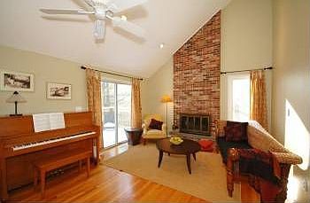 End 2 level unit at Drummer Boy Homes w/3BR, 2 full baths & a beautiful LR/DR space w/gleaming hardwood floors, soaring vaulted ceilings, a brick fire place & sliders to private deck. Enjoy the serene MST BR w/cozy window seat & the updated light & bright eat-in-kitchen. The completely finished walk-out lower level includes a family room w/a wood burning stove & 3rd BR, office & working sauna. Recent upgrades include new windows, new compressor, new hot water tank plus more.