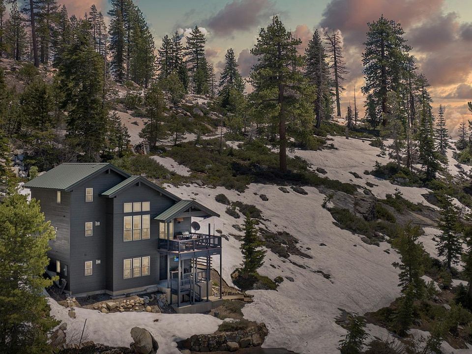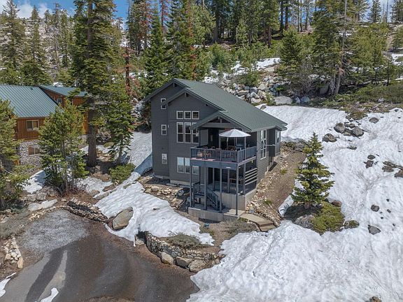 This stunning mountain home is nestled in the heart of the enchanting Bear Valley ski village, offering an unrivaled location next to the celebrated Skyline Bear Valley Resort. With its close accessibility, outdoor enthusiasts will delight in the convenience of skiing or hiking to their doorstep. The home boasts an array of captivating features and thoughtful design elements. As you approach, you'll be greeted by stacked granite rock retaining walls and steps that lead you to a covered entry deck made of composite decking. Ceiling racks under the upper deck store kayaks and paddle boards, year-round. Upon entering, a spacious mudroom awaits, complete with built-in storage, a bench for de-booting, and wood-look tile floors. On the main level, you'll discover a cozy living space adorned with a propane fireplace featuring a stacked ledge stone hearth and a rustic, roughly-hewn wood mantle. The engineered wood floors add warmth and charm to the room. The kitchen standouts, showcasing alder shaker cabinets, quartz counters with a subway tile backsplash, a luxury Rohl bridge faucet, and a propane range equipped with a poaching burner for the culinary enthusiast. Not to mention, the kitchen offers breathtaking views of snow-capped peaks and mountains. A walk-in pantry, along with a second refrigerator, provides ample storage space. The living room exudes grandeur with its vaulted ceilings, massive exposed glulam beams, and expansive windows that bathe the space in natural light while offering delightful tree-top views. The primary en-suite bedroom on the first floor features a propane free-standing log stove with a slate hearth, creating a cozy and inviting atmosphere. Another bedroom and a guest bathroom can also be found on the main level with exterior patio access. Heading to the upper floor, you'll discover the third bedroom, accompanied by another full bath. Each floor of the home offers a bedroom and a full bath, allowing for privacy and convenience. The bathrooms are adorned with alder cabinets, solid surface counters, and elegant bronze fixtures that add a touch of sophistication. An open loft overlooks the living and dining areas, serving as a versatile space for media enjoyment and additional sleeping arrangements with two sleeper chairs and a secret kids' nook. Throughout the home, you'll find desirable features such as central heating, 4-panel solid fir doors, and energy-efficient LED can lighting. Exhibiting a curated and tasteful aesthetic, most of the furniture and furnishings in the home will transfer with the property, ensuring a seamless transition for the new owners. In summary, this mountain retreat offers a harmonious blend of natural beauty, impeccable craftsmanship, and stylish comfort, making it an ideal sanctuary for those seeking a serene mountain lifestyle. Bear Valley Lake is located just a mountain block away.